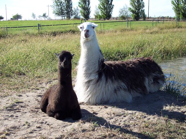 Passed away July 18, 2013. Diagnosed with kidney failure at WSU in 2004 at age 14, and again in 2006, with never before seen creatinine levels in a live llama yet acted completely normal aside from loss of appetite. Kidney biopsies found 100% scar tissue. She was expected to die within a couple weeks of discharge each time but somehow managed to maintain herself and remain bright and alert, exhibiting happy dances at treat time. February 2013 she went off feed and returned to WSU only to find that kidney function appeared normal per blood test but liver infection was evident. She was given antibiotics. Tough as nails and smart as a whip, possessing the gentlest of dispositions, no llama taught us more about the mental faculties of camelids, as well as their physical fortitude. She was one special lady and is sorely missed by the herd and all that knew her well. "Granny May" babysitting Rowdy. |