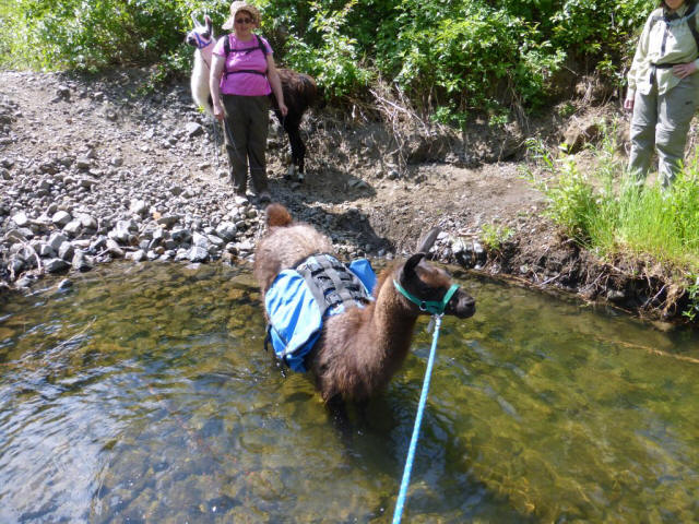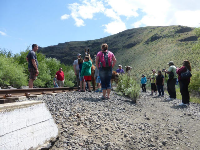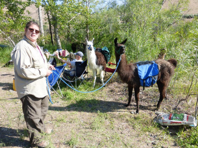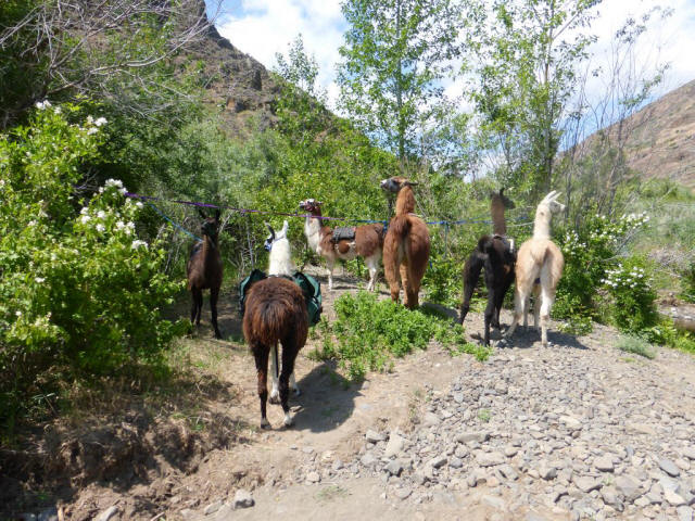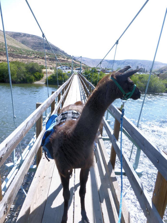 Memorial Day Weekend 2016May 27-30, 2016. (Friday - Monday) The Umtanum recreation site is located in the scenic Yakima River Canyon, 12 miles south of Ellensburg, Washington, which cuts through massive basalt cliffs and rolling desert hills. This canyon has been designated as a state scenic route and offers excellent wildlife viewing, fishing in a Blue Ribbon trout stream, family river rafting and camping. A wooden and steel suspension footbridge crosses the Yakima River at this site, providing the only access to the west side of the river in the Yakima River Canyon. The west side of the river consists mainly of BLM and Washington Department of Fish and Wildlife managed lands. For more details about the site, see Umtanum Creek2015 With the varied terrain and obstacles, this is an excellent llama training site. King Asher's Legado (2 years old) and Prince Robin Williams (under 2 years old) accompanied us for their first excursion. We were very pleased with their performance, completing a large number of first-time experiences without difficulty. They both took to it like naturals. Without any prior towel training or other props, they saddled easily, just standing in place through the entire process. Both sported the smaller (but just like it's bigger cousin) Flaming Star "Trail Boss" pack system. Being young and their first time, they weren't carrying much weight -- just a few pounds in each pannier. Of course the first significant obstacle is the suspension bridge crossing. It was rather windy so the bridge was swaying and bouncing. There is a narrow entry gate to the bridge to block other than foot traffic so normal sized panniers have to be removed and reattached to get onto the bridge landing. Water crossings, including thigh deep, were handled without much trepidation, even though they had never before seen open or moving water. Of course brushy obstacles, including some thorny wild rose, was no problem. Tying out was no problem, either high line on the treks or on ground tether while at base camp. Figuring out ground tethers is a difficult challenge for llamas but neither of them managed to get into any serious trouble. Of course the eleven llamas drew considerable attention wherever they went. There were quite a few dogs around which were concerning to the llamas, providing one of the most difficult challenges of all. While tied out Robin did attack one large dog that was approaching Legado when Legado had managed to short-tie himself to a tree and was quite defenseless. None of the dogs acted aggressively and most were on leash or carried. It provided quite a few stepping off the trail exercises. The boys also loaded onto the van for the first time without trouble, each taking about a minute to figure it out -- Robin first and then Legado, which is a high jump up with only the aid of a knee board. They rode comfortably with no fuss whatsoever -- getting along fabulously and valuing each other's company. All-in-all our youngsters generally behaved as though they have been packing for years. It helped to have a couple of experienced packers to mentor the llamas-in-training, which could be emulated. Llamas learn very rapidly simply by seeing something demonstrated. That's the primary purpose of this training opportunity. For those that missed it this year, you missed out on a great event! |